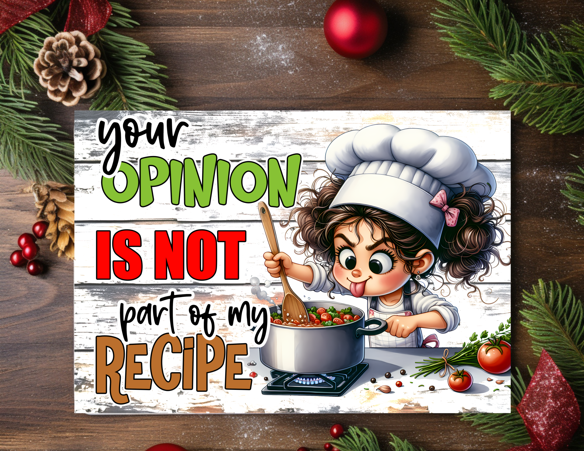 Glass cutting board with funny lady and phrase Your Opinion is Not Part of My Recipe